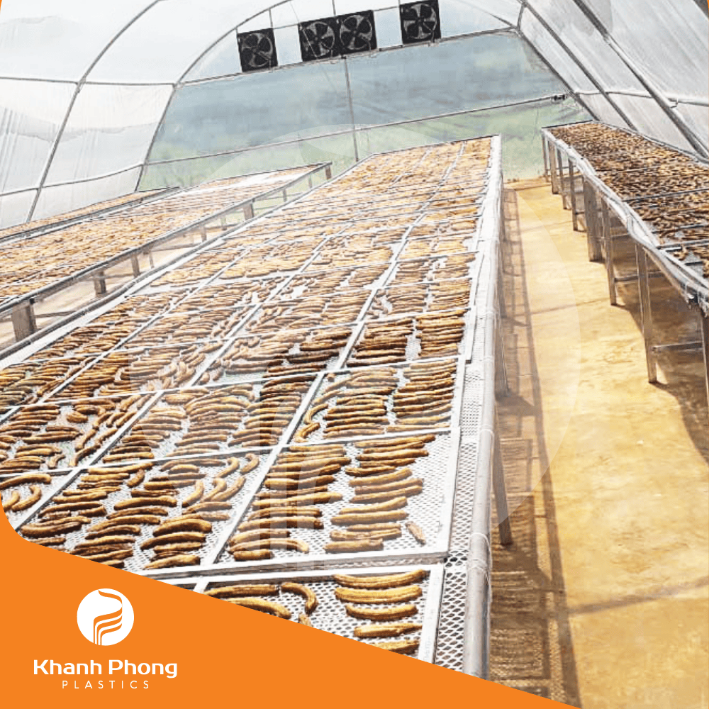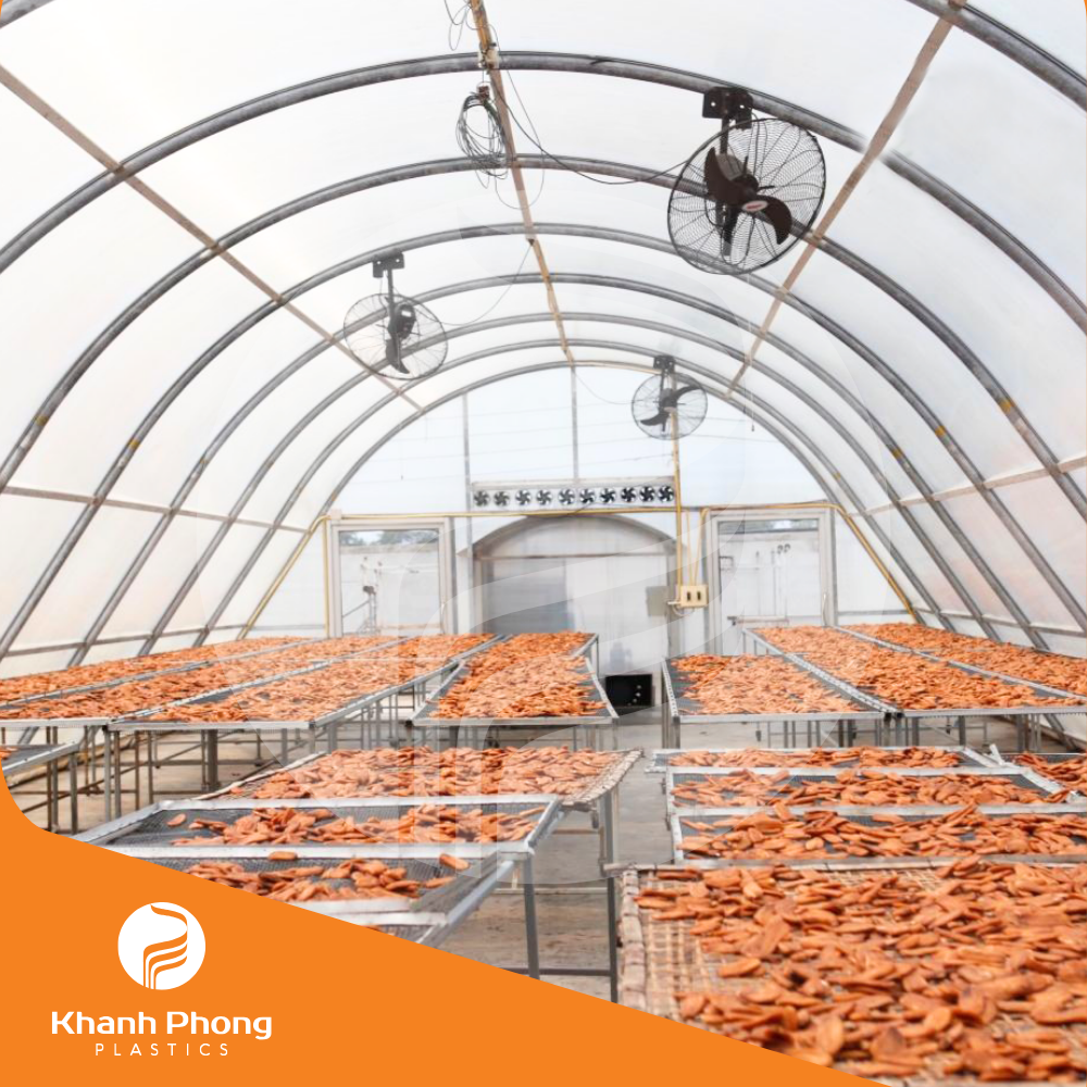 Khi kết hợp với thiết kế thông gió, sàn phơi hợp lý, màng nhà kính giúp nông sản khô nhanh hơn 30–50% so với phơi ngoài trời, giữ được màu sắc và hương vị tự nhiên, đặc biệt phù hợp với các sản phẩm có giá trị cao.